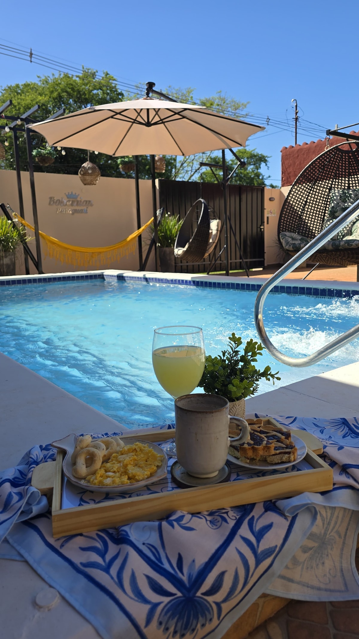 The cozy guest house is idyllically situated in front of the mountain “Cerro Acahay” in the countryside and invites you to relax or to hike up the “local mountain”. The property is easily accessible as it is located directly on the asphalt road. However, the guest house itself is approx. 300 meters from the road. Next to the house is a Qunicho / a free-standing covered terrace with hammocks, which invites you to linger.