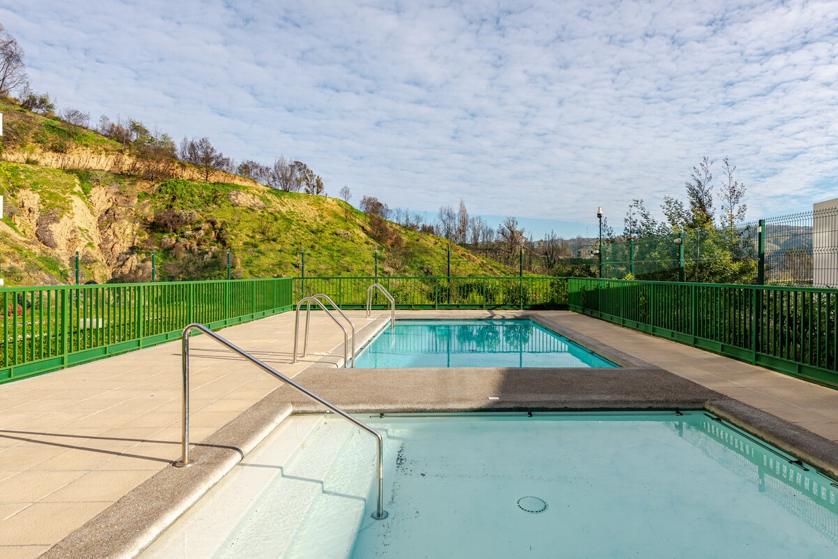 Enjoy a comfortable stay in this quiet apartment 20 minutes from downtown Viña del Mar. Close to La Campana National Reserve and Olmué. With WiFi, cable TV, washing machine, steam iron, and others. We include sheets, towels, and toiletries for personal care. Kitchen with oven, refrigerator, kettle, microwave, toaster. Business in front of the building. This cozy space gives you the ideal atmosphere to enjoy your visit to the area.