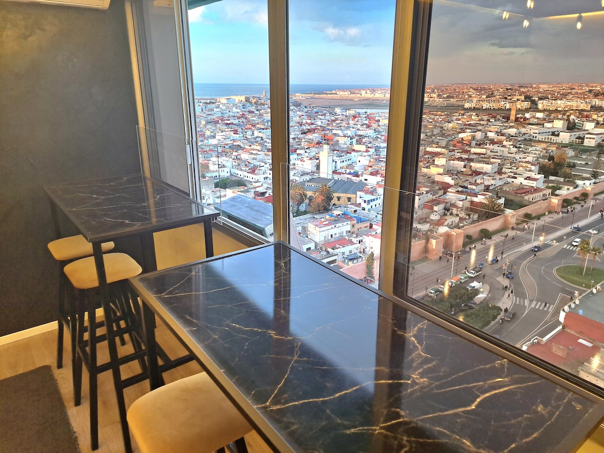 Luxury, Comfort and View. - Completely renovated apartment at the top of a tower, unique, ideally located in the city center of Rabat, close to all sites and amenities, making it easy to plan your visit. - Breathtaking panoramic view worthy of a master painting, extending over the ancient Medina, the Atlantic, the Abou Regreg River, the Kasbah of the Oudayas and several emblematic monuments. - The entire apartment has a fascinating view day or night.