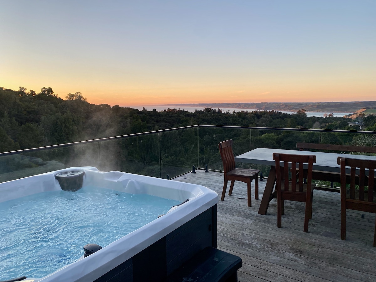 Nestled 280 meters above sea level and just 20 minutes from Raglan, our studio offers a serene escape from the everyday hustle. With breathtaking 270-degree views of the ocean, the majestic Mt. Karioi, & the rolling landscapes. Enjoy a romantic evening stargazing in the outdoor bath, surrounded by tranquility. Embrace serenity in this idyllic hideaway, where every moment is a chance to breathe deeply & relax. Fyi we’re on a gravel road, for winter no heating in the single room, lots of blankets.