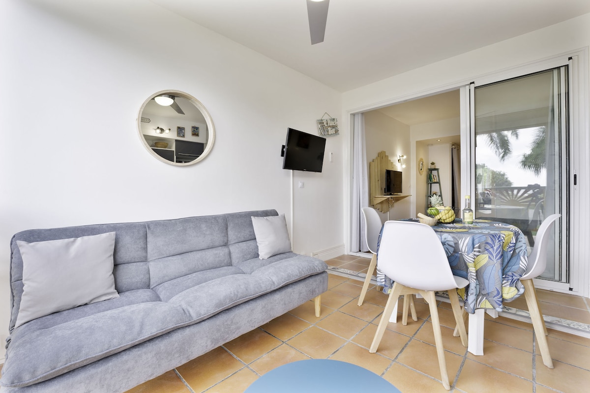 Studio for 2 people (child or baby possible with folding bed) beautiful sea and pool view with parking in secure residence WIFI/SAT TV Netflix in superb area with beach and pool, located in Saint François. 2nd and top floor of the Corail residence at Anse des Rochers, facing the sea and palm tree tops, white sandy beach 100 meters away, pool 50 meters away. Completely renovated with a design and charm spirit, air-conditioned for your comfort, terrace loggia with equipped kitchen.