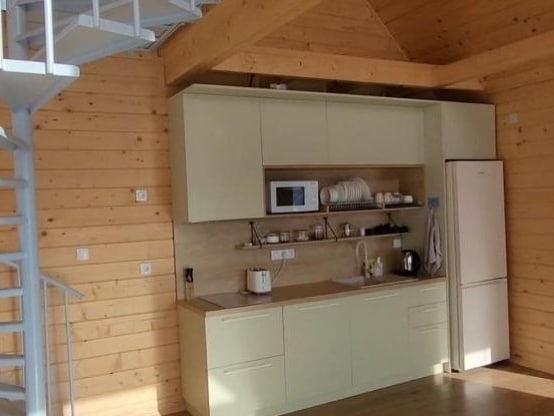 A two-story house, each floor is a three-bed room with a separate entrance. The room has a double and single bed, TV, refrigerator, bathroom. On the first floor, the room has a kitchenette equipped with a stove, microwave, kettle.