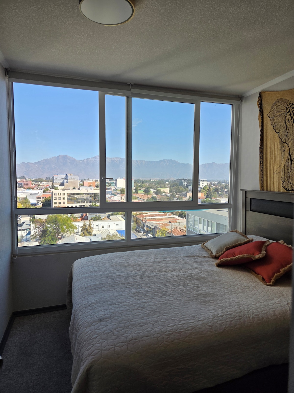 Enjoy a cozy, bright space designed for relaxation, ideal for working in peace or getting around Rancagua easily. Not suitable for parties or gatherings. It has a beautiful view, where you can enjoy a cozy atmosphere at sunset. It is a safe place with controlled access and 24-hour surveillance cameras. Its privileged location allows you to connect to the north and south access, Regional Hospital, close to supermarket, INACAP, mall, gas stations and restaurants.