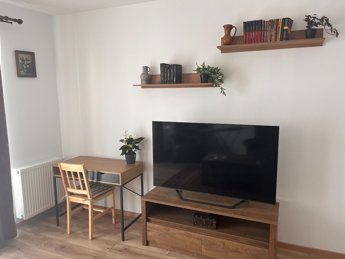 The studio is located in the yard, it is cozy and clean,ideal for people who want to spend a holiday in a quiet place near Brasov. We have swings, outside toys for children,hammocks and others. For animal lovers, in the garden,we have poultry and a dog. Surroundings: Poiana Brasov,Dino Parc Rasnov, Bran Castle and others. At request we offer: * outdoor barbecue; * the table and an iron. Coffee is included in the price.