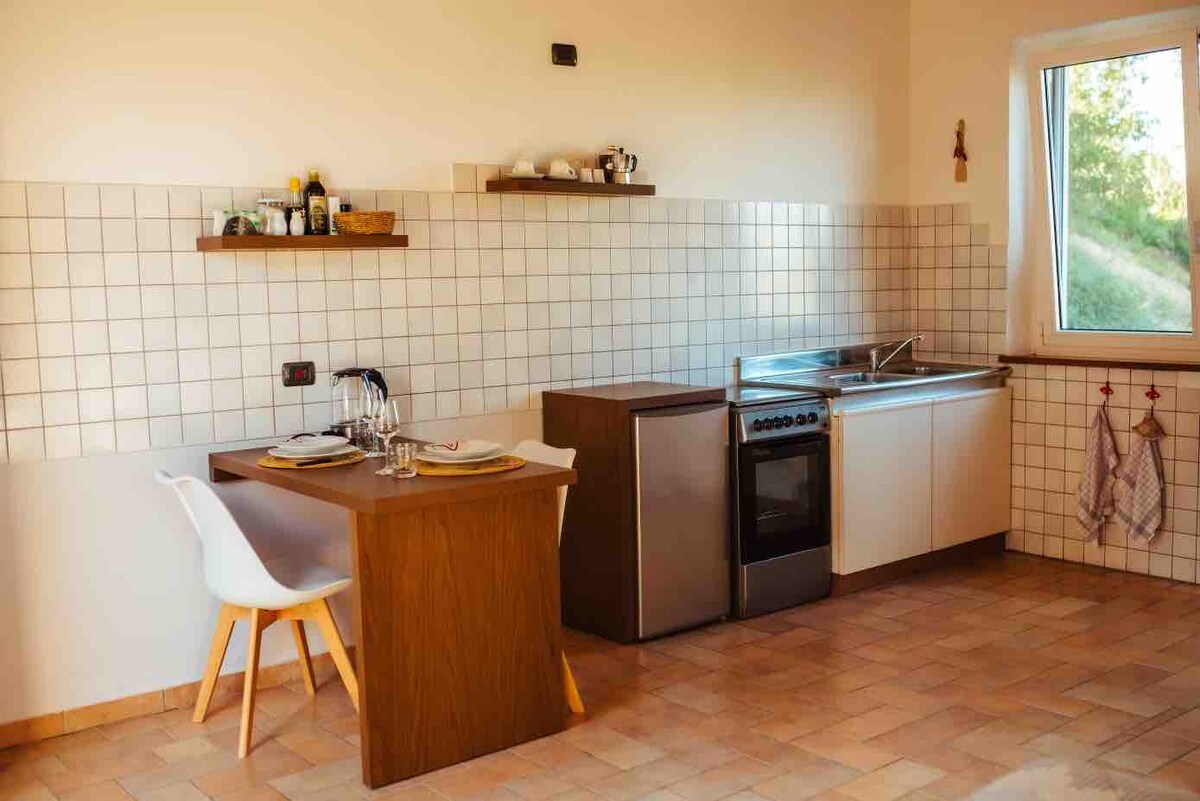 Newly renovated apartment, located, large shared equipped garden, furnished with tables and chairs, deckchairs, barbecue and shaded pergola. Stunning view of the sunflower and wheat fields. Located in a strategic area to reach the renowned beaches of Fano, Riccione, Gabicce, Cattolica, Numana, Sirolo in 30 minutes... and the numerous cities of art. A 5 minute walk to restaurant, the apartment will be provided with all the necessary information.