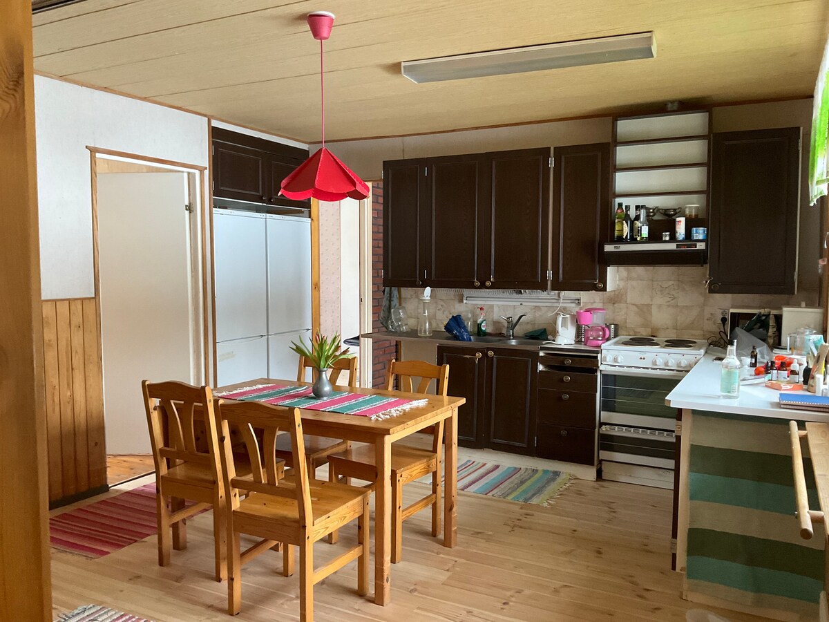 A 52 m2 house in a great location by the river in its own yard, inhabited year-round. Centrally located about 35 kilometers from the city center and next to the golf course. The house has a double bed, as well as a sofa bed for sleeping. Kitchen and 2 rooms, toilet, and bathroom. The air heat pump cools the house in the summer. There is also a beach sauna in the yard. A guest house with two more beds is available from mid-April until October. The dock is removed and will be returned after the ice has melted.