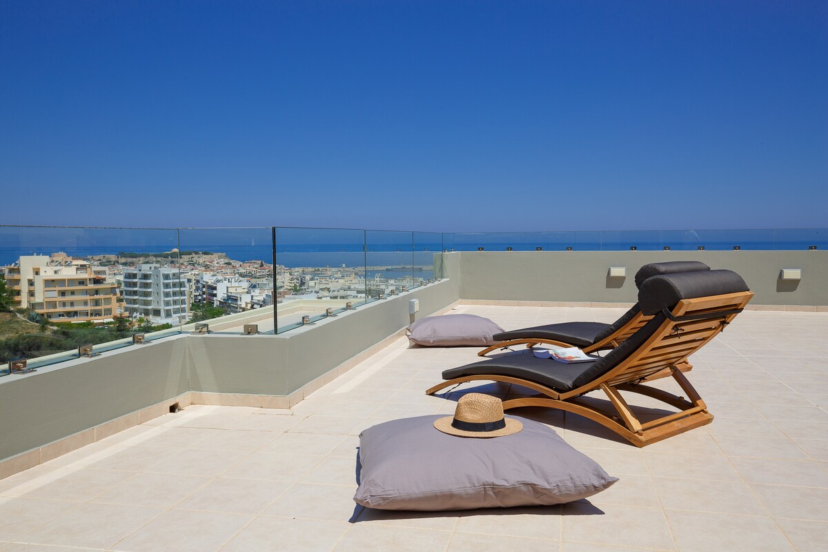Stelios Penthouse is a beautiful apartment located in the center of Rethymno town, in a walking distance from all tourist attractions, popular amenities and old and modern parts of the town. The view from the penthouse apartment is extraordinary, towards the city, the old town, the pine trees hill, the harbor, the Fortezza castle, the sea and of course the magnificent romantic sunset.