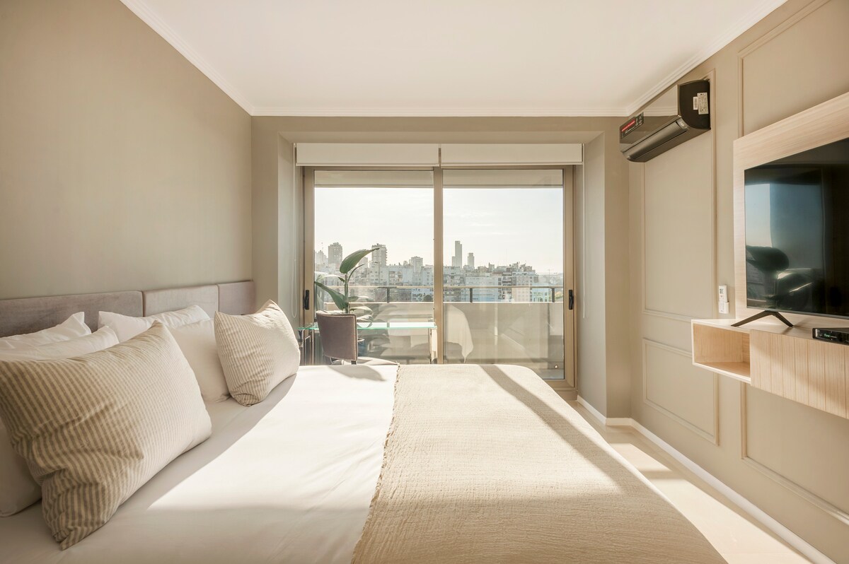 Brand new studio apartment with kitchinette, bathroom and balcony with great views in the heart of Recoleta. Cool modern decoration, fully equipped and safe. SmartTV with cable and Netflix (login with your account). Building with great facilities: heated indoor pool, outdoor pool with solarium, spa with massage room and sauna, and gym. Walking distance to the best restaurants, bars and cafes, as well as to bus and subway station.