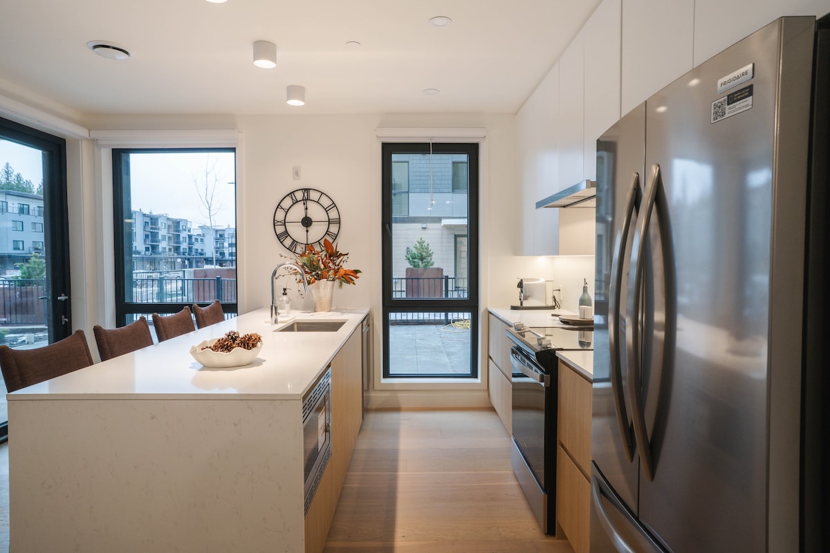 Welcome to Four Peaks Penthouse, a bright and contemporary 3-bedroom, 3-bathroom retreat in the heart of Revelstoke. Designed with both comfort and style in mind, this penthouse is perfect for families, groups of friends, or couples seeking a luxurious mountain getaway. The open-concept living, dining, and kitchen area is flooded with natural light and thoughtfully furnished, creating a welcoming space to relax, gather, and enjoy meals together.
