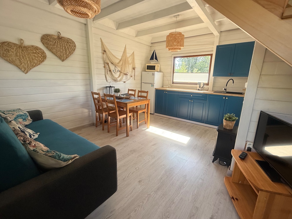 Tęsknisz za bliskim kontaktem z przyrodą? Kochasz aktywnie spędzać czas? Cenisz sobie wygodę i komfort? Jeśli tak, to na pewno pokochasz to miejsce od pierwszego wejrzenia! Masz do wyboru jeden z czterech dwupoziomowych klimatyzowanych domków, w których może swobodnie mieszkać do 6 osób. Na parterze znajduje się salon z kanapą, aneksem kuchennym i łazienka z prysznicem oraz taras z meblami ogrodowymi, natomiast na piętrze znajdują się dwie dwuosobowe sypialnie, a także łazienka z wanną.