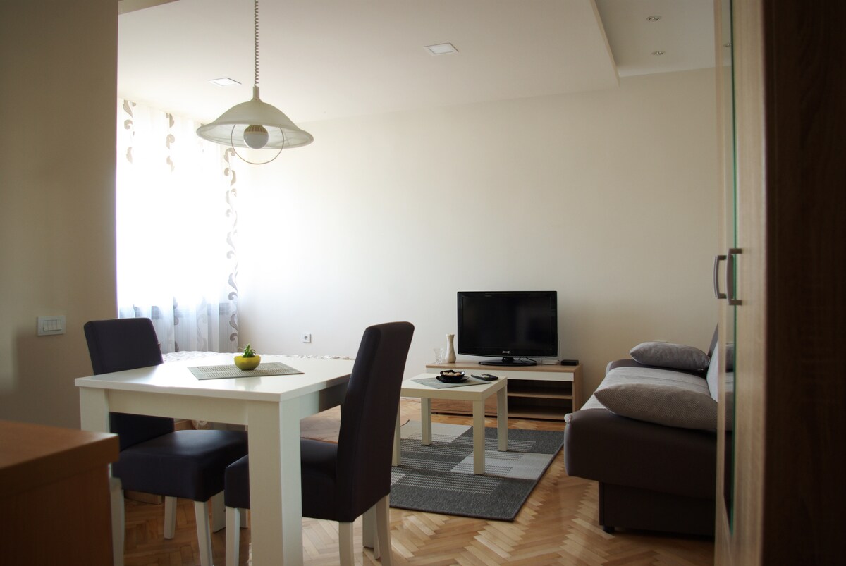 The best location in town, located in the City Center in a quiet environment, with beautiful Center view, two minutes walking distance to Mother Teresa Boulevard. Building is secured with entrance card, elevator, and upon request with basement floor parking place. It's close to bakery, grocery stores, coffee shops and Museums. It can accommodate three adults, or it is also suitable for families (two adults plus two kids).
