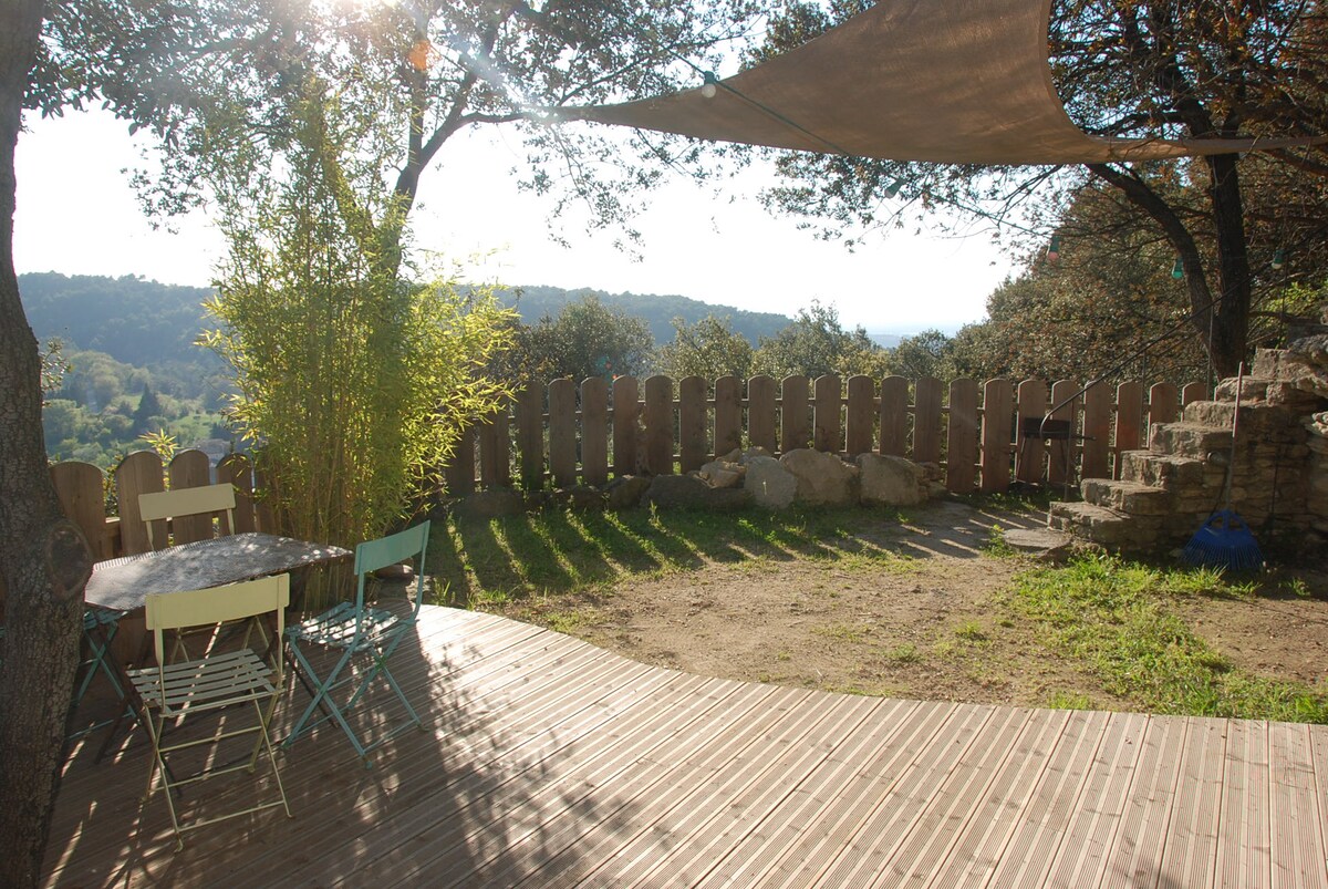 A blissfully peaceful and beautiful retreat. The renovated cottage is a small 2 storey house perfect for 2 people, in a magnificent estate of 94 acres of chestnut forest, sublime experience for nature lovers, who want to get away from the hustle and bustle, wonderful walking trails, magnificent views. Natural small pool on the property but there is a sublime swimming spot at 9km. Bedroom and wood heater upstairs, bathroom, separate toilet and open kitchen downstairs. Private terrace.