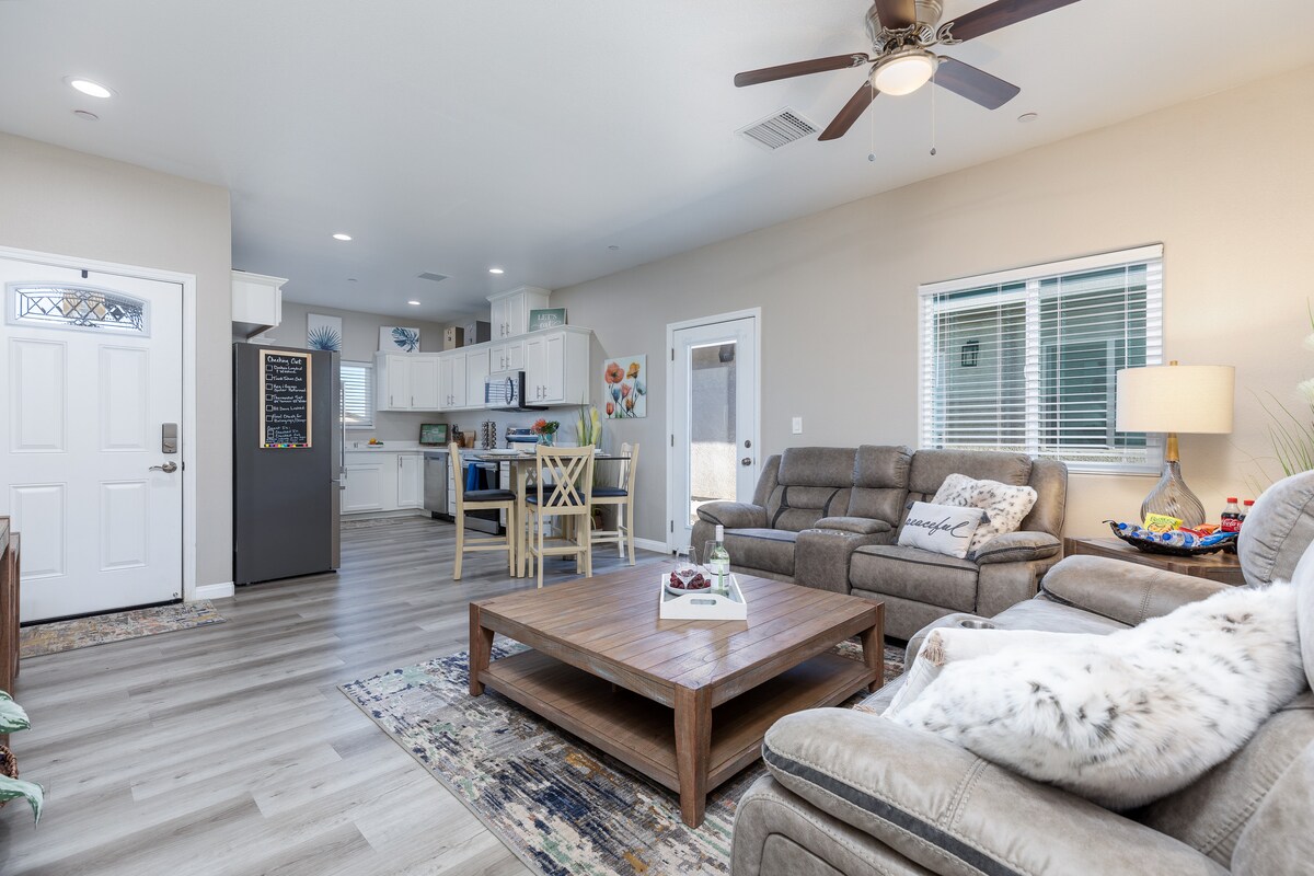 RELAX in this brand new, mid-century modern, 4-bedroom home after exploring the nearby national parks. Plus a newly added EV charger! Charge your electric vehicle during your stay! ✔ Huge Master Suite ✔ 4 Comfy Bedrooms ✔ Open Design Living ✔ Fully Equipped Kitchen ✔ Dedicated workspace ✔ Back Patio w/ BBQ ✔ Smart TV w/ Roku ✔ High-Speed Wi-Fi