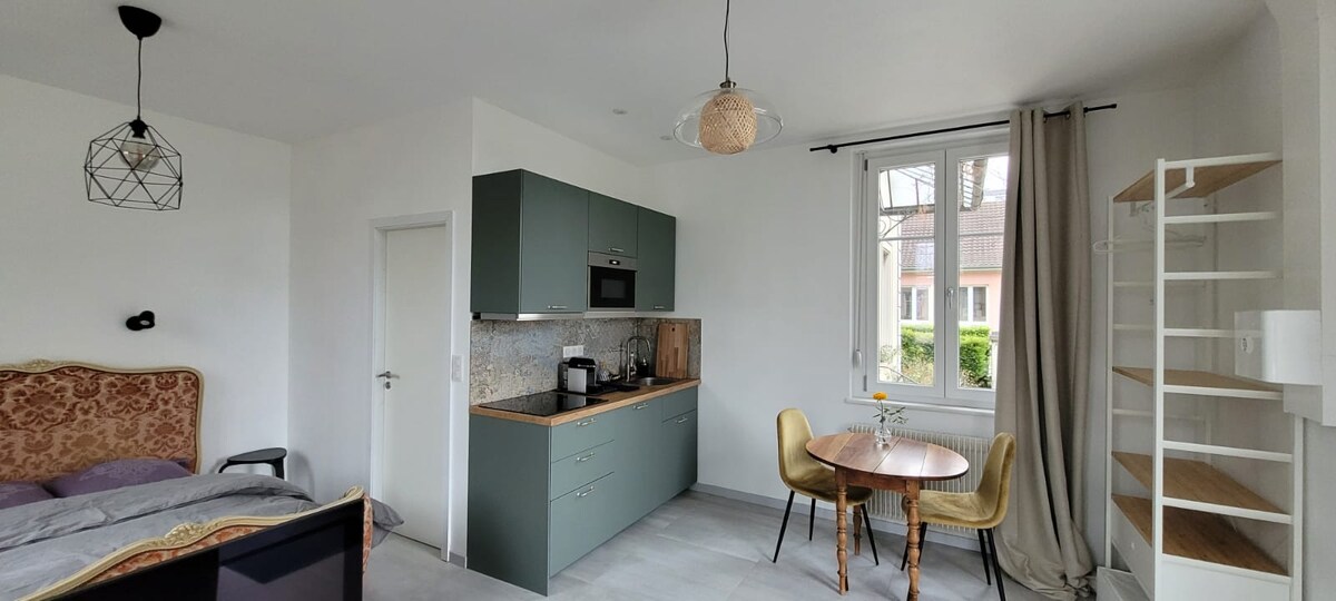 Fully renovated studio, bright and with warm decor, ideal for a quiet stay surrounded by greenery. Advantages: + quick access by car. Easy and free street parking. Close to the train station and downtown Mulhouse: 5 min by bike, 20 min by bus and 25 min on foot. Quick access to highways. + being within walking distance of all amenities (grocery stores, Super U, La Poste, etc.) + Netflix and RJ45 jack // Wi-Fi + access to garden and barbecue