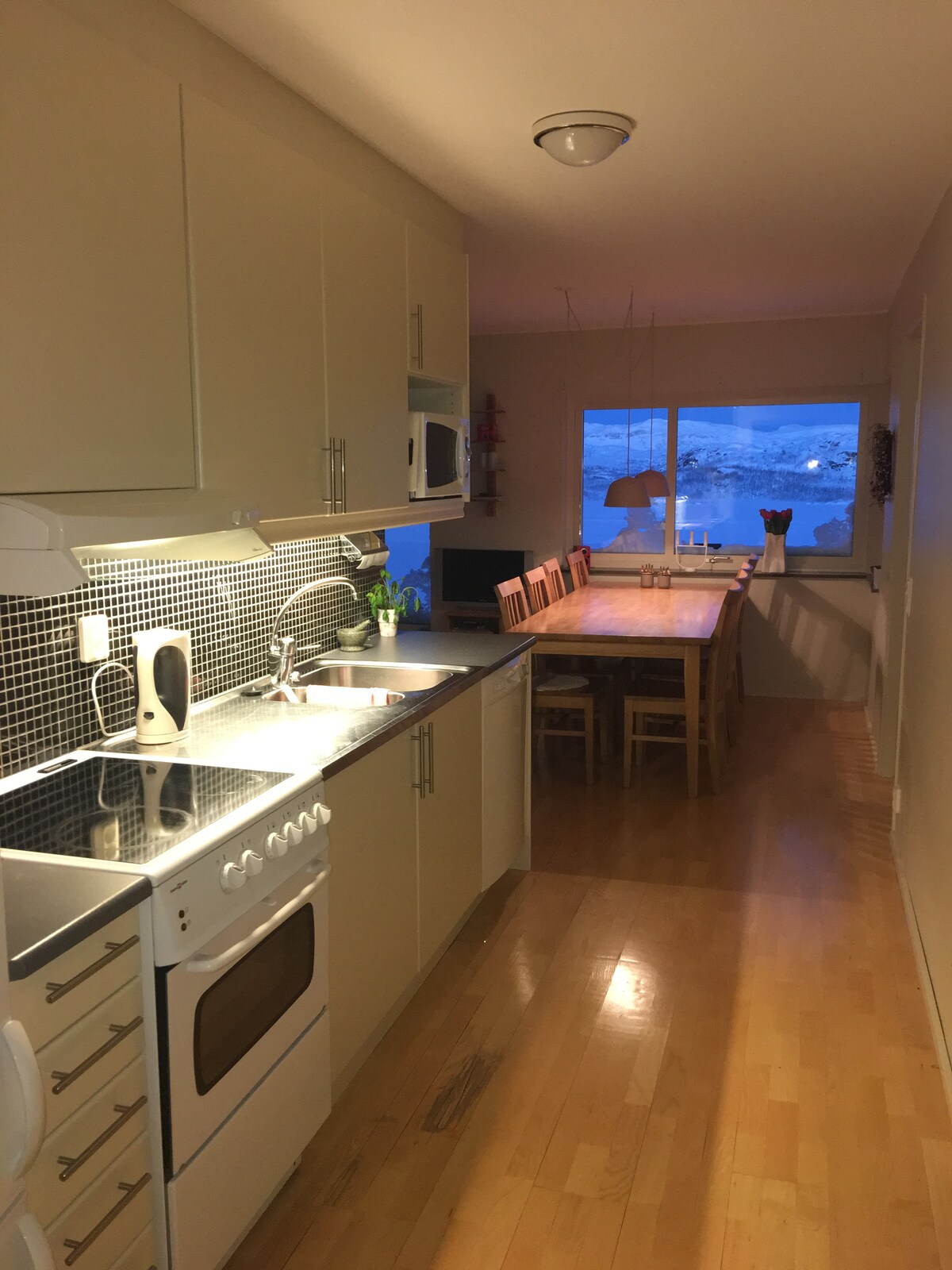 Studio apartment separate entrance. Windows facing a garden and the midnightsun/ sea / northern lights. Gardentable, garden chairs. Doublebed 150cm High speed wi-fi, cable tv. Kitchenette, two plates stove. Tea & Coffee and BREAKFAST included. Microwave, Fridge/freezer necessary equipment. Dinnertable for two. Bathroom with window. Washing machine + dryer. Located in central Narvik in a quiet part of town. 9min walk city center, railwaystation and flight bus. 3min walk to a small beach.