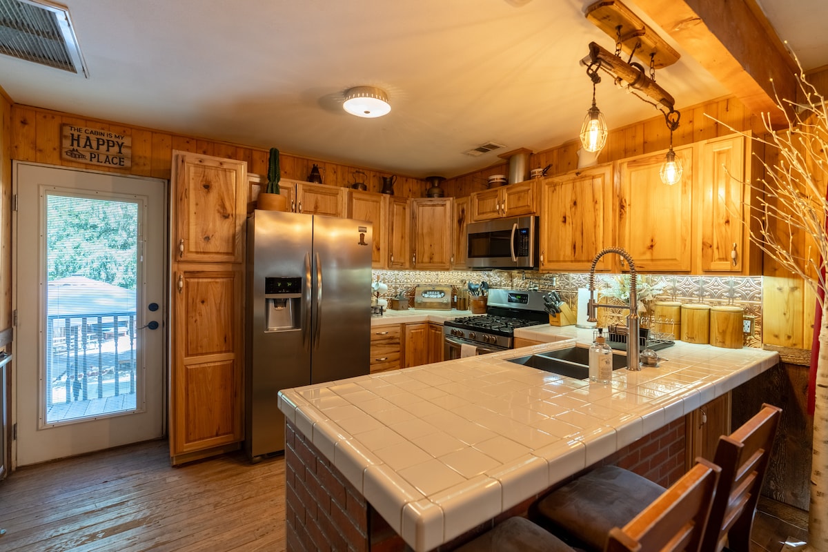 Kick back and relax in this stylish space, vintage cabin. Luxurious amenities include: 1. Fully prepped kitchen with Le Crueset pots and pan, Kitchenaid appliance and many more. 2. Comfortable and stylish living room with Sonos sound system and television with soundboard & subwoofer. 3. Large and sophisticated dining room to enjoy a gourmet meal or to useas an office space. 4. One third acre of property surrounded by forest and privacy. 5. Large outdoor patio to have a meal with nature.