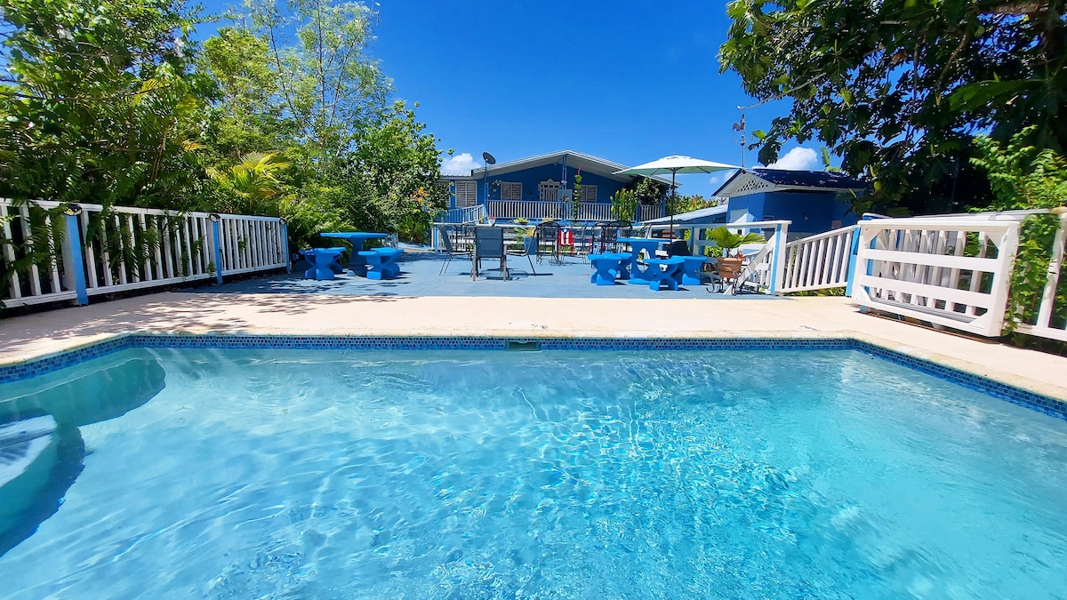 Bienvenidos a La Casa Azul B&B. Nuestra Casona está ubicada en la costa oeste de Puerto Rico; entre los pueblos de Aguada y Rincón. Este es uno de los cinco acogedores apartamentos de nuestra hospedería. Disfrutarás con nosotros de nuestra excelente area de piscina, bosquecito, museo privado y nuestro pequeño cultivo de cacao donde damos el Cacao Tour. A solo minutos encontrarás las mejores playas y atractivos turísticos de la región. Queremos que vivas a lo Boricua!