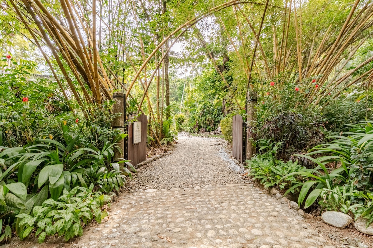 Casa del Bambu: A spacious retreat with a king bed in the bedroom, a twin bed in the living room (another second twin bed upon request), A/C, two smart TVs, high-speed Starlink WiFi, a large bath with a hot shower, and hot water at every faucet. Enjoy cooking in the fully equipped, screened-in semi-outdoor kitchen and unwind on the serene terrace amid lush landscaped gardens, just a 5-minute drive to Puerto Jiménez, close to beaches, restaurants, banks, and amenities.