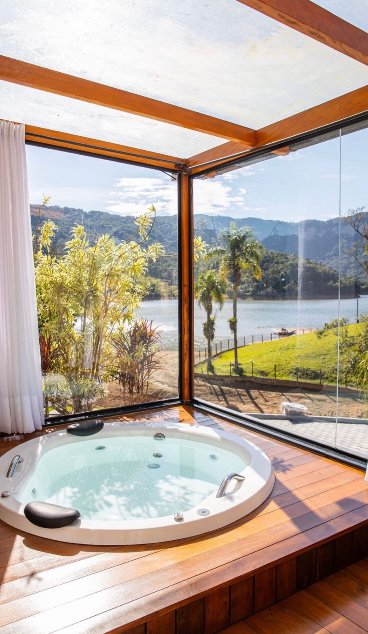 This place has a style all its own amid tranquility and nature. It's a charming getaway! Come and relax in a bathtub with a beautiful view of the lake and mountains. The space is integrated: a queen bed in front of the bathtub, a sofa in front of the fireplace and a fully equipped kitchen. A spacious and elegant bathroom, it has 2 showers and products for use. A strategic point for visiting the Vale Europeu on the border of Rio dos Cedros (5 minutes by car from the center, 35 minutes from the Lakes Region), Timbó 9 minutes and Pomerode 12 minutes away.
