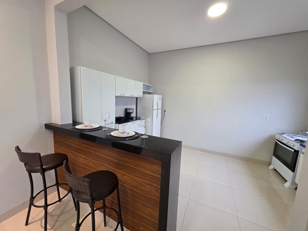 Located in the city center, this house is for those looking for comfort, practicality and a great location. • Combined living room and kitchen; • Cozy bedroom: equipped with a queen size bed, air conditioning and wardrobe. • Bathroom: clean, well lit and with a hot shower. • Outdoor area. • Garage for two cars. A few meters from supermarkets, pharmacies, restaurants and everything you need for a quiet and convenient stay. Book now and feel at home even away from home.