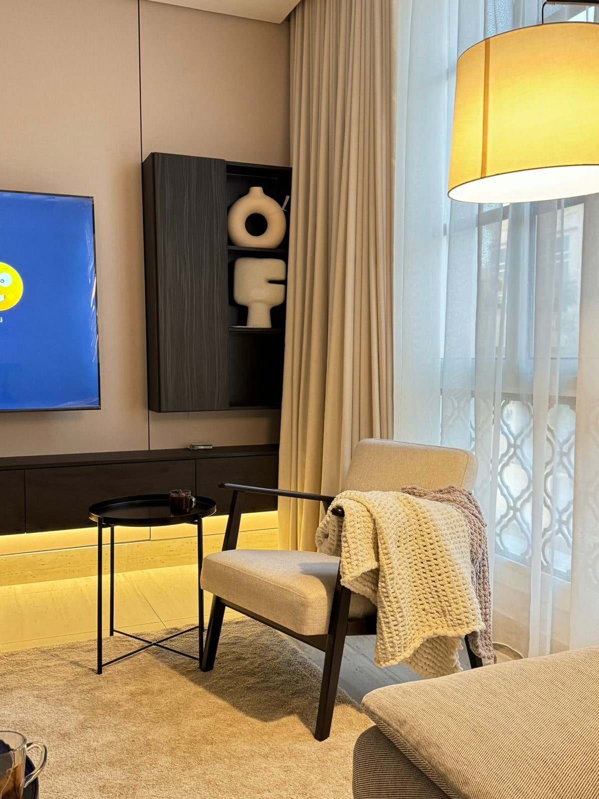 This studio is ideally located in the heart of the upscale Malqa neighborhood, close to the boulevard and the vibrant destinations of Riyadh. The residence is equipped with high taste to provide you with a luxurious and comfortable stay experience, as it contains a 65-inch screen, and a very large bed that guarantees you maximum comfort, in addition to luxurious furniture and elegant interior design that befits the fine taste. Whether you're on a business trip or for rest and recreation, you'll find everything you need for an exceptional stay