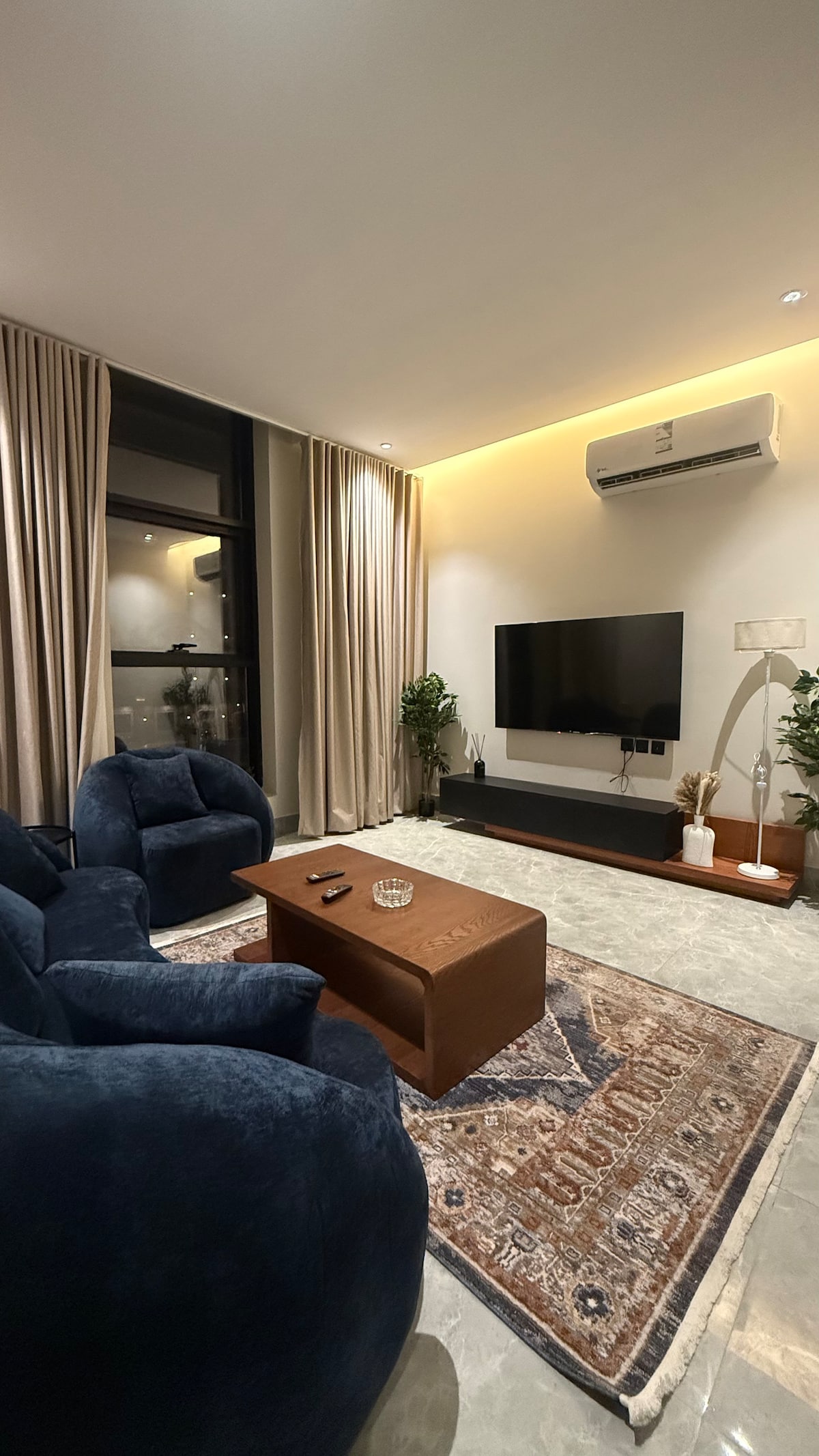 A modern apartment designed for an exceptional stay, located in one of Riyadh’s finest neighborhoods with a stunning view of KAFD. It features an outdoor seating area with a screen and projector for enjoyable evenings. For your comfort, the bed includes a high-quality 14cm extra layer. “We also offer event coordination services for special occasions (including cake and accessories) for an additional fee with prior booking, ensuring an unforgettable experience “