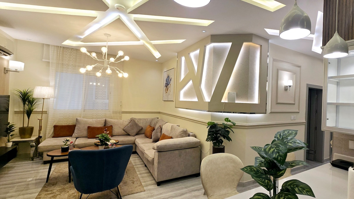تقع هذه الشقة الفاخرة في قلب أحد أرقى أحياء الرياض، حيث تتناغم الأناقة العصرية والتكنولوجيا مع التصاميم الثقافية الأصيلة. تتميز الشقة بمساحاتها الواسعة التي تضفي شعوراً بالرحابة والراحة، وتتميز بتفاصيلها الدقيقة التي تعكس ذوقاً رفيعاً. جدرانها بأسقف عالية، تحوي حديقة وجلسة خارجية خلابة تبعث على الاسترخاء. تتميز الشقة أيضاً بإضاءة خافتة ودافئة تخلق أجواءً مريحة، وتحتوي على قطع أثاث فاخرة مصنوعة من أجود أنواع الرخام و الأخشاب. "تعتبر هذه الشقة ملاذاً مثالياً للاسترخاء والاستجمام والهدوء والذوق"