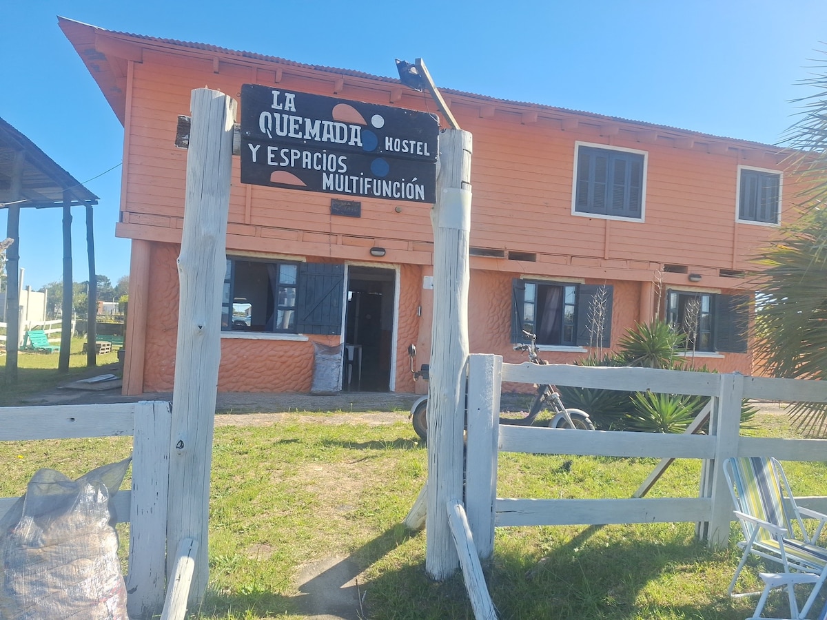Hostel facing the sea! Economy Quadruple Room, two bunk beds. Shared Bathroom Fully equipped shared kitchen and shared living areas. Shaded outdoor dining room. Enjoy the beach until its golden hour and return home walking on the sand...