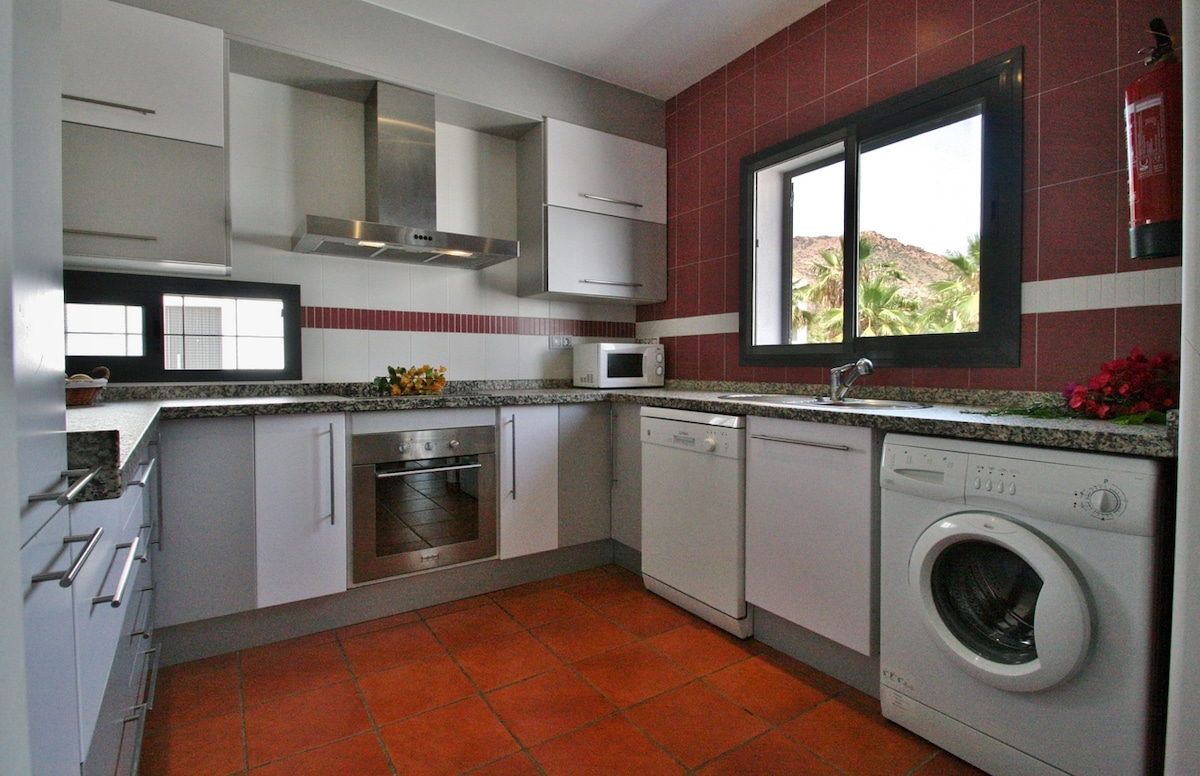 Downtown. 2km El Playazo. No crowds. Awning, A/C in the living room and 3 fans, one in each room. WIFI. Pellet stove in the living room and electric radiator in the master bedroom. Comfortable for couples or single people. Large 14-meter terrace. 3 bedrooms with 150cm bed, 135cm bed and two 90cm beds, 6 places for families. Combi fridge, oven, ceramic hob, dishwasher and microwave. 2 full bathrooms. Teleworking area. 5km from Las Negras. Center of the park. Easy to park.