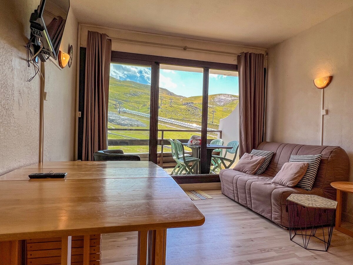 Apartment with balcony and superb view of the slopes. Direct access to the shopping mall and the slopes by elevator, all on foot and close to GR10. 23 m2 cocooning ideal for 2 adults and 2 children (or 4 adults), located in the Super Arlas residence on the 5th floor. Pleasant living room with kitchen, TV, microwave and oven, stove, fridge, filter coffee maker and kettle. A sofa bed 160 + 2 beds 90. Blankets and pillows provided. Ski storage.