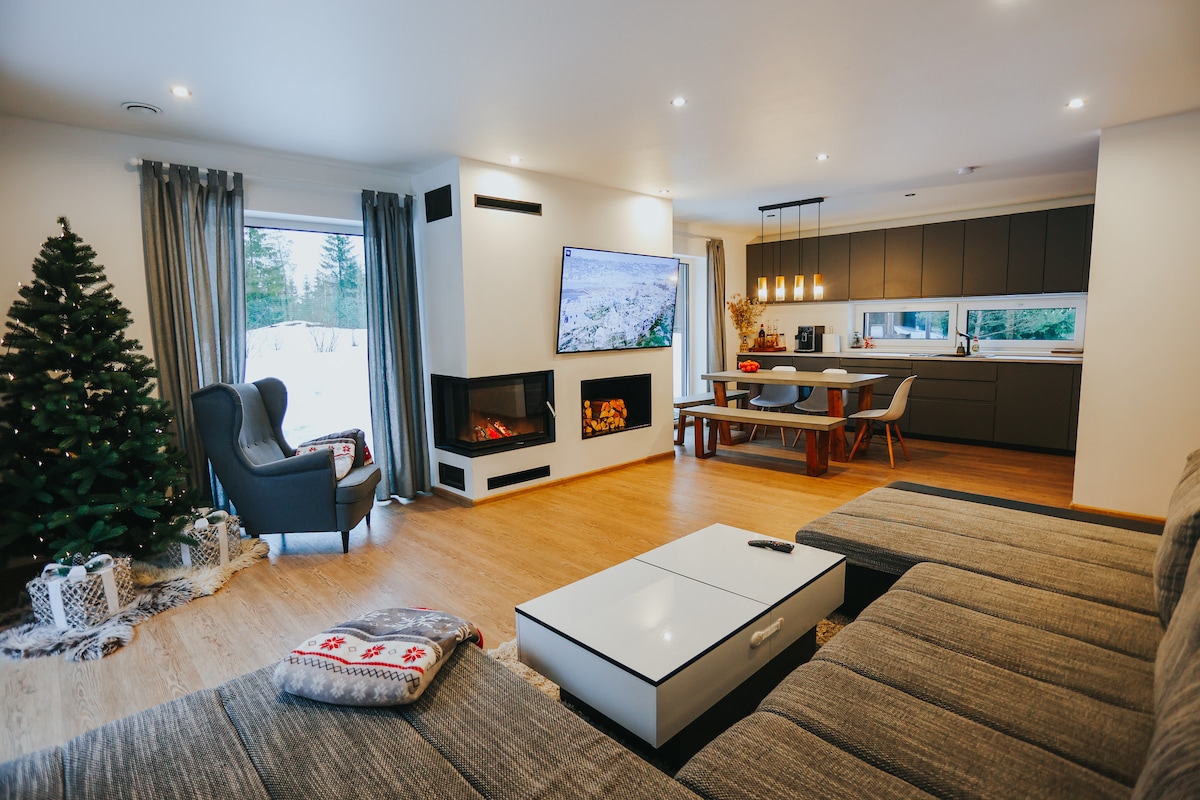 Spacious & modern wooden house is located next to the road A2 (E77) - Riga and Sigulda are 15 min away, Gaujas National Park ~ 30 min drive. All house is very well equipped and is at your service (except one room) as well as barbecue facilities outside, table tennis, berries, mushrooms, garden, fireplace, fun & more :) Usually guests are not bothered by the road, but please be aware of existing transport sounds, so this is a place in the nature with some urban touch.