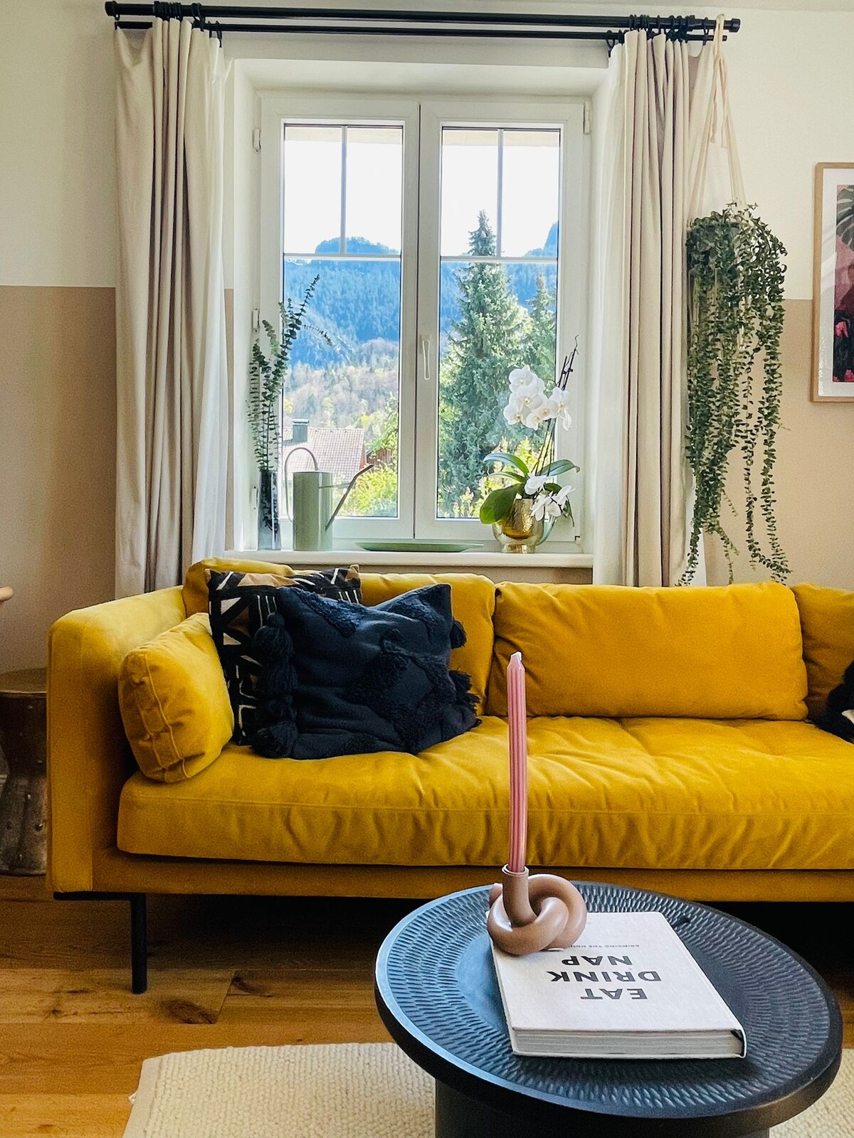 colourful room looking on an apple orchard
