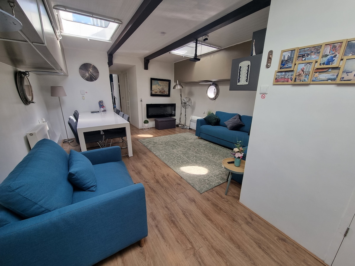 On this authentic boat you can live like a Rotterdammer, on a fantastic location right in the center of the city. The apartment on the Animathor has been completely renovated, but is still very much a boat. Your apartment is in the front of the ship. It has a private entrance, kitchen, a deck terrace and a fantastic view. The boat has three levels, there is a salon, a bedroom and bathroom below and a roof terrace on the top deck. You can reach the boat by an easy gangway.