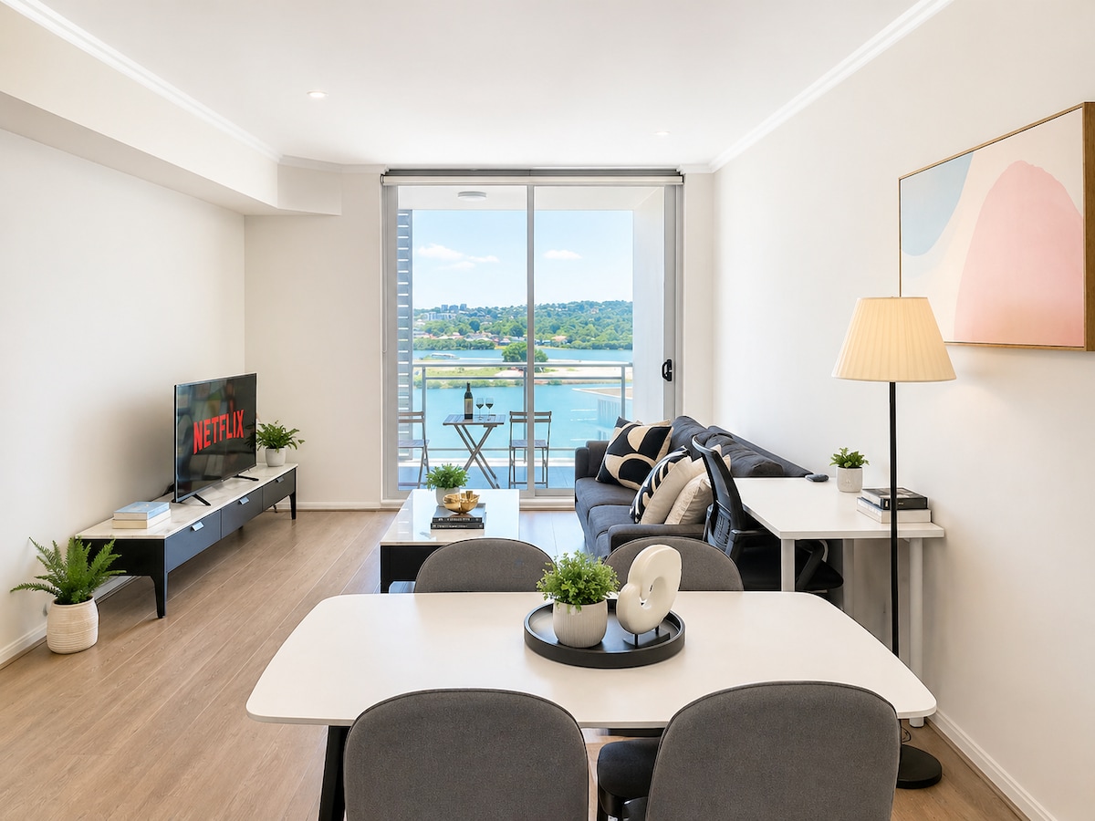 3 mins walk to the Coles 5 mins walk to Rhodes train station Welcome to your stylish riverside home in Rhodes — perfectly positioned for convenience, comfort, and a beautiful waterfront lifestyle. Enjoy peaceful walks along the Parramatta River, relax in nearby parks, and explore the vibrant foreshore community right outside your door. Combining location, comfort, and modern living, this apartment is ideal for families, groups, and business travellers.