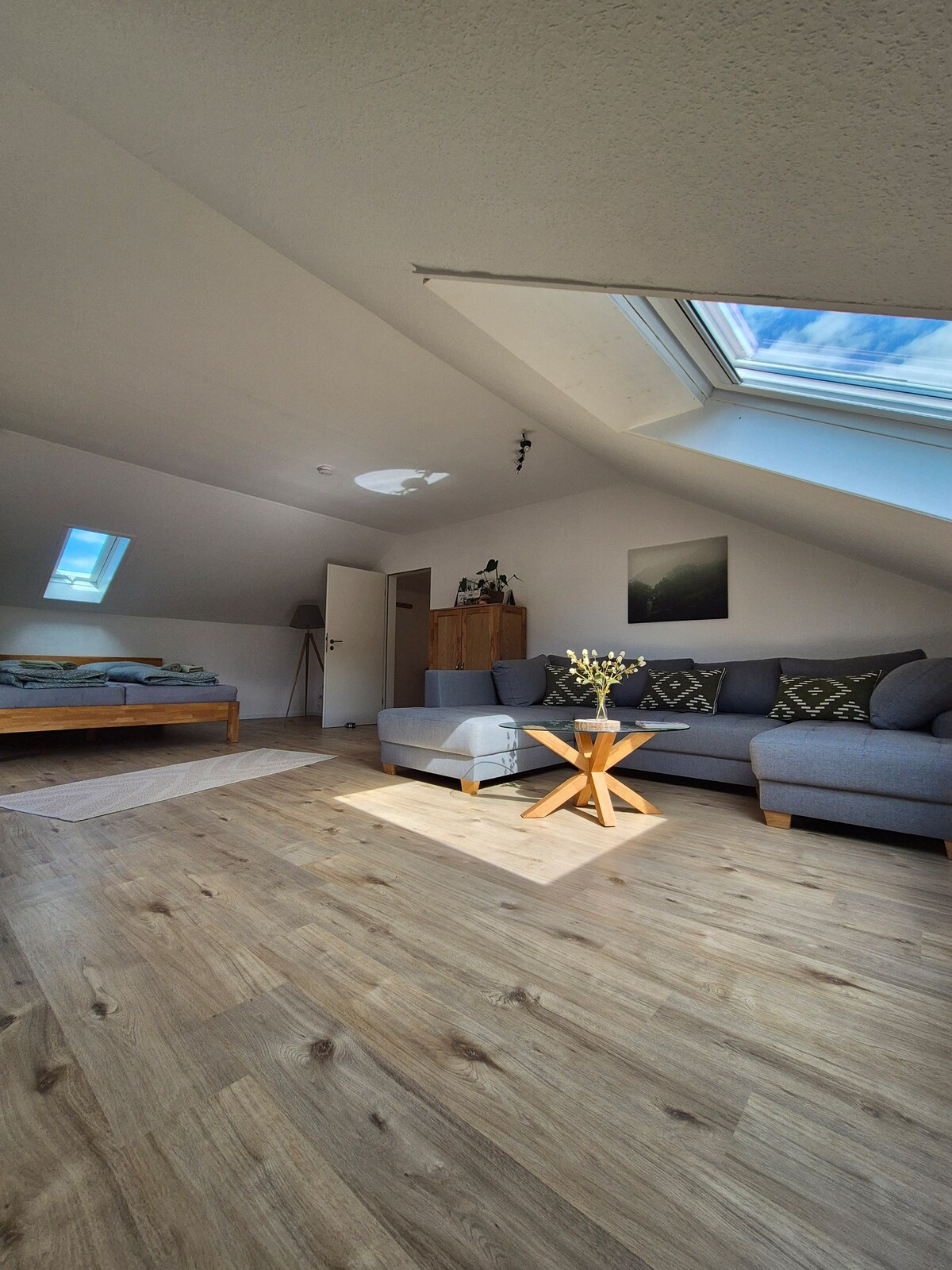 We offer our guests a newly built and fully furnished apartment in the quiet Kassel district of Kirchditmold. This is a lovingly converted attic with a separate entrance, which was recently completed and is equipped by Holzaura. Here our guests will find a living room with integrated kitchen, shower + sink & bedroom. The toilet with sink is located separately in the apartment. Internet access (Wi-Fi) & a TV are provided.
