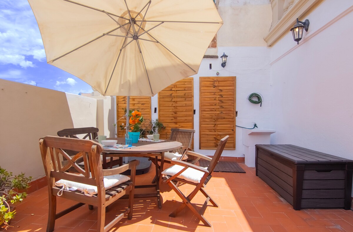 This gorgeous 90m2, bohemian duplex ONE BED apartment has amazing views over the entire city from the large plant -covered terrace. Walking distance from Las Ramblas. There is a bedroom with Queen sized bed downstairs beside a long balcony and another open-plan living area upstairs beside the terrace. There's a smart Tv, free wifi and washing machine and dryer. (please note: it's on the 6th floor and there's NO elevator).Tourist tax (€6.25 per person/per night) IS INCLUDED in the nightly price.