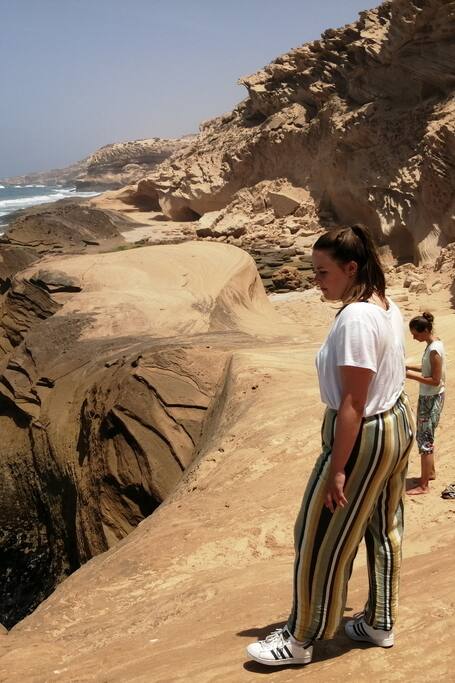 Willkommen, Marhaban, Bienvenue und Welcome! Das im maurischen Stil erbaute Haus liegt am Hang direkt an der Atlantikküste. Im oberen Stockwerk befinden sich 2 Apartments mit Duschbad und Terrassen, im unteren Stockwerk Küche, Schlafzimmer, Bad und Wohnzimmer mit Kamin. Zwei Terrassen mit Garten münden auf den glatten Felsen. Zum hauseigenen Strand sind es nur 3 Gehminuten. Je nach Wellengang kann man auch direkt vorm Haus ins Wasser springen.