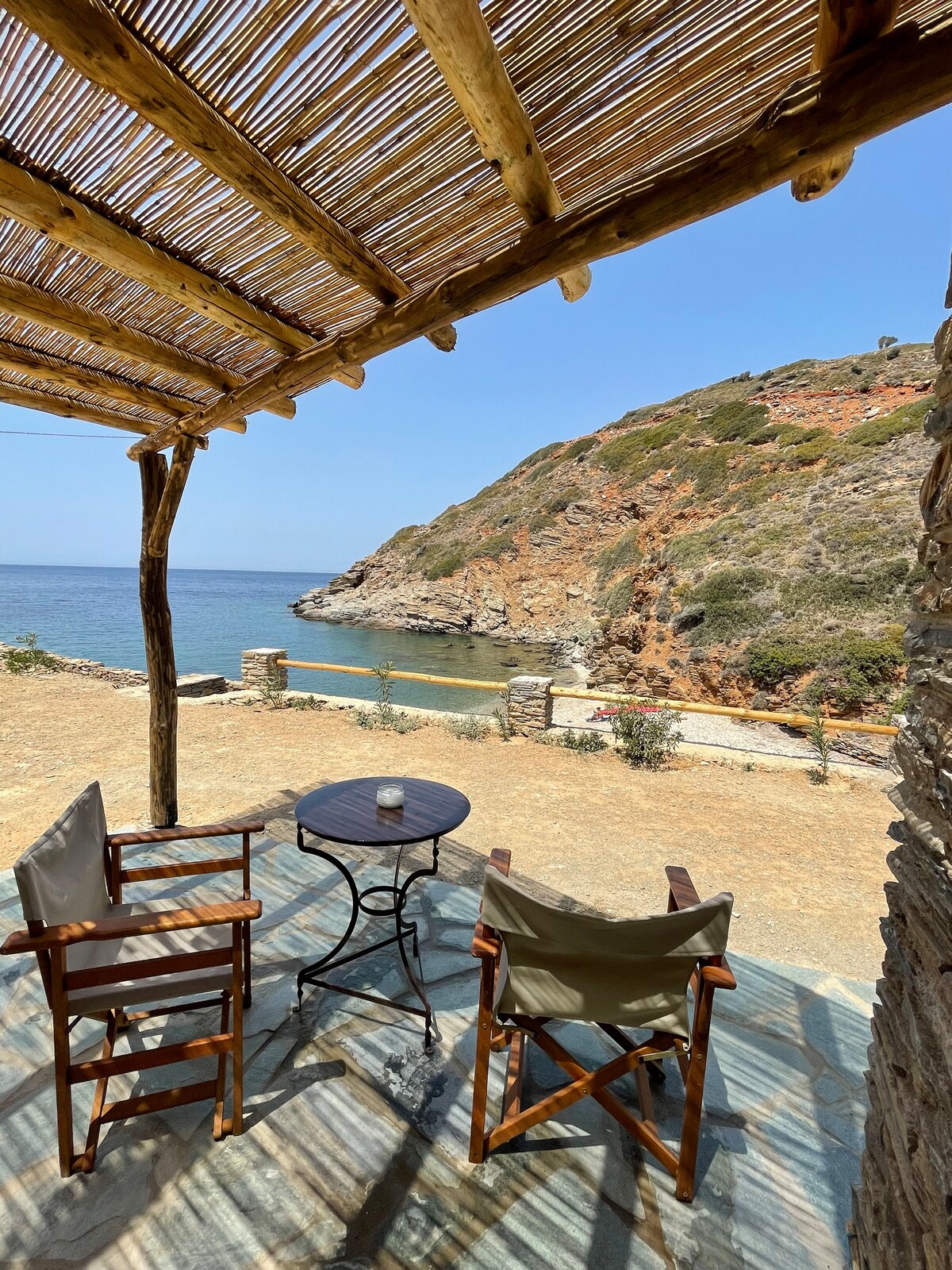 Πέτρινη σουίτα 10 μόλις μέτρα από την παραλία . Πολύ μεγάλα παράθυρα για να απολαμβάνετε την θέα Θάλασσα , εξωτερική πέργκολα με καθιστικό και τραπέζι . Πλήρη επιπλωμένη κουζίνα και άνετο μπάνιo/ντουζιέρα. Καθώς ανεβαίνετε τα ξύλινα σκαλοπάτια φτάνετε στο υπνοδωμάτιο όπου από το οποίο μπορείτε να απολαύσετε καλύτερα τη θέα της θάλασσας. Η έντονη παρουσία του ξύλου σε συνδυασμό με το χτιστό κρεβάτι και τον καναπέ σε παραπέμπει στα αρχοντικά σπίτια των Κυκλάδων.