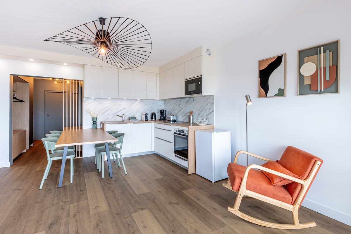 Enjoy, with family or friends, a cozy stay facing Bonne Source beach in Pornichet. Elegant and carefully decorated, the apartment is designed and equipped for the comfort of travelers. It has parking and can accommodate 5 people comfortably. Ideally located a few grains of sand from the ocean, you will enjoy the balcony to share a meal or simply admire the view while listening to the sound of the waves. A bubble of sweetness during a stay in our superb region.