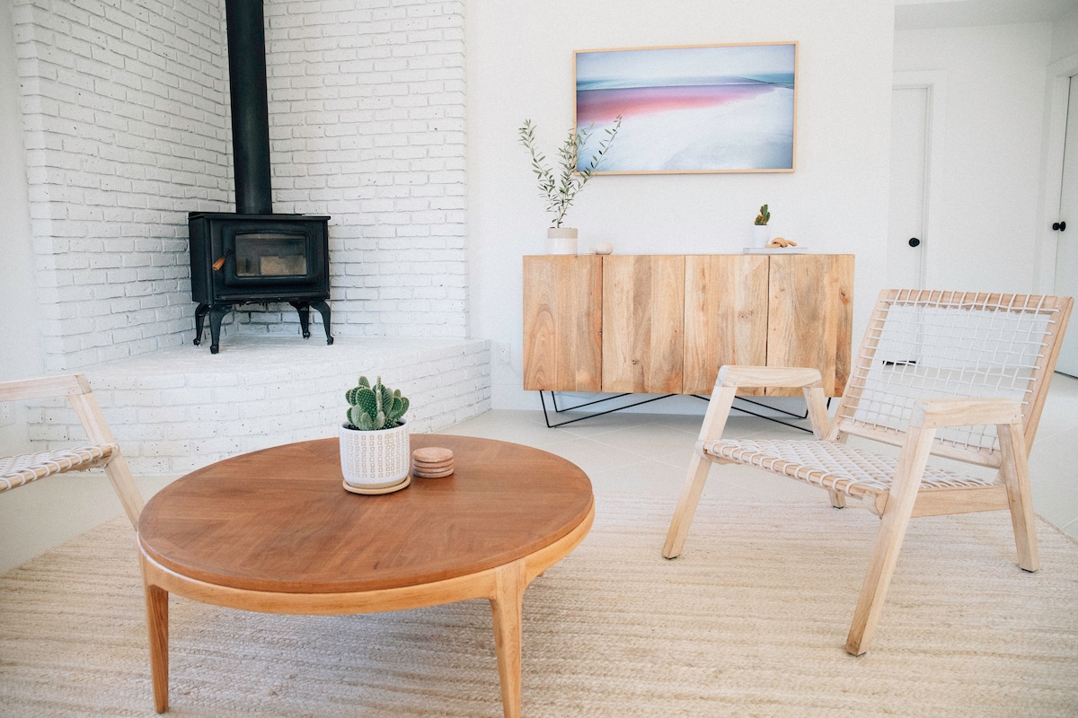 Come retreat, relax, and recharge in the Zen Den—a modern 1BR/1BA casita in Pioneertown near Joshua Tree. 🌵 Wake up to sweeping views of the Sawtooth Mountains and Pipes Canyon, then sip coffee on the patio rocking chairs or lounge out back under big desert skies. Enjoy the outdoor kitchen (BBQ, fridge, sink + toaster oven), cool off in the shared saltwater pool, and end the day with a soak in the private hot tub on the back patio. ✨ Add us to your wishlist or book your dates now. ❤️