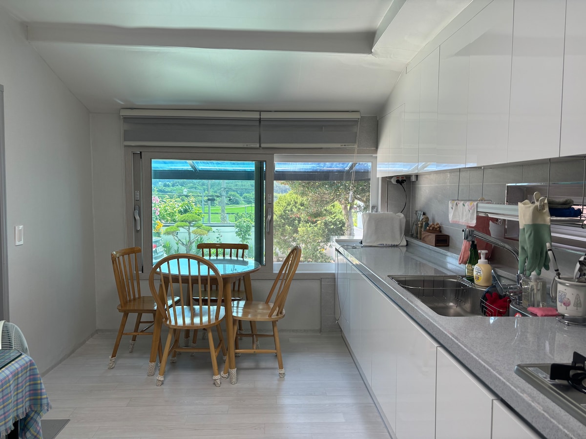 It is a brick house that has been there for a long time, where you can see the shining yunseul that falls on the sea in the early morning and the beautiful sunset that will stop everyone in the evening. You can feel the warmth and coolness together by opening the large window so that you can see the blue sea from all spaces. With the warmth of wood and the retro feeling that brings back the happiness of old memories, we would like to share a page of a comfortable and enjoyable trip with those who have visited. Accommodation Rules -Check-in is after 3pm, check-out is before 11am. - No smoking in all rooms and indoor spaces. -Amenities are provided. -Air conditioners are available in each room. -Capsule coffee is provided. What to know before you book -Fish or meat grilled dishes must be cooked outdoors with the burner provided. -After 10pm, we restrict drinking and eating on the outdoor deck to respect the neighbors who live together. Thank you for your understanding. Refunds are subject to the Airbnb Refund Policy.