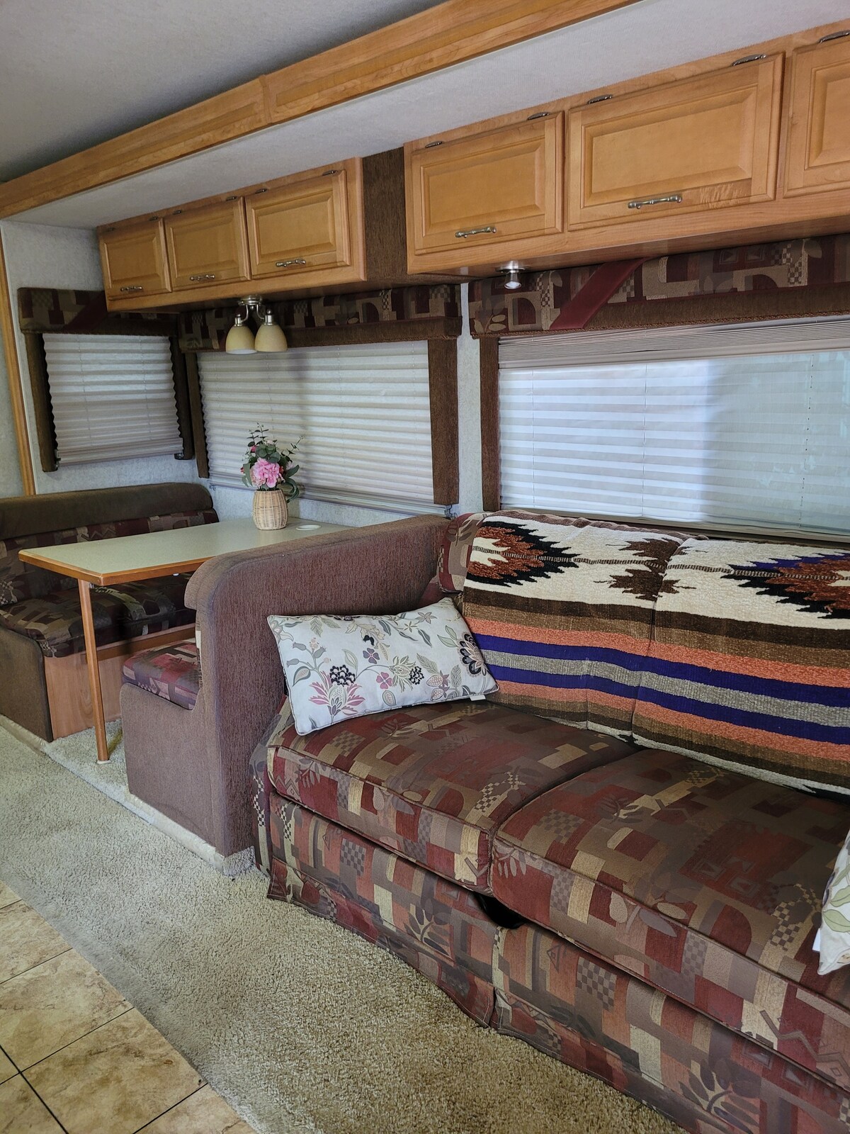 This memorable place is anything but ordinary. We have you covered in our nearly new 2021, 28', travel trailer. This beautiful RV features, a separate master suite w/a queen bed, 2 nightstands & a wardrobe on each side. Theres a full size booth table that seats 4, comfortably. There are 2 full size bunk beds & sofa opens to a comfy little spot for 2, to watch TV. There’s a DVD player and movies for use. Full kitchenette (dual hot plate) & fridge, microwave & pantry. Coffee press available.