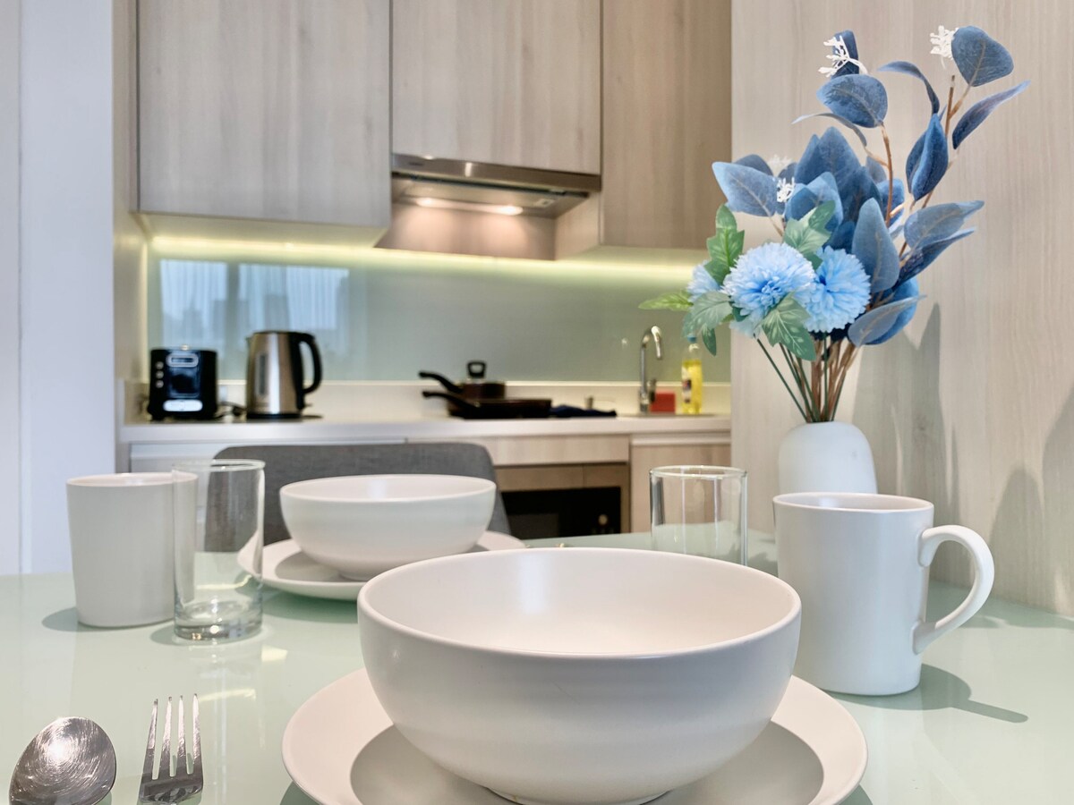 A spacious entire apartment with private bath, kitchenette, living/dining, 1 bedroom with designated working area, balcony and daybed. Enjoy the wide windows for uninterrupted views and plenty of sunlight, increasing airiness for a more relaxing stay. Enjoy all the conveniences of city-life, including: - 5 min to BTS Asok, MRT Sukhumvit - 5 min to Terminal 21, Emporium/Emquartier and Benjasiri Park - 1 min to 7-11 convenient store - Lots of street food, cafe and taxi/bikes