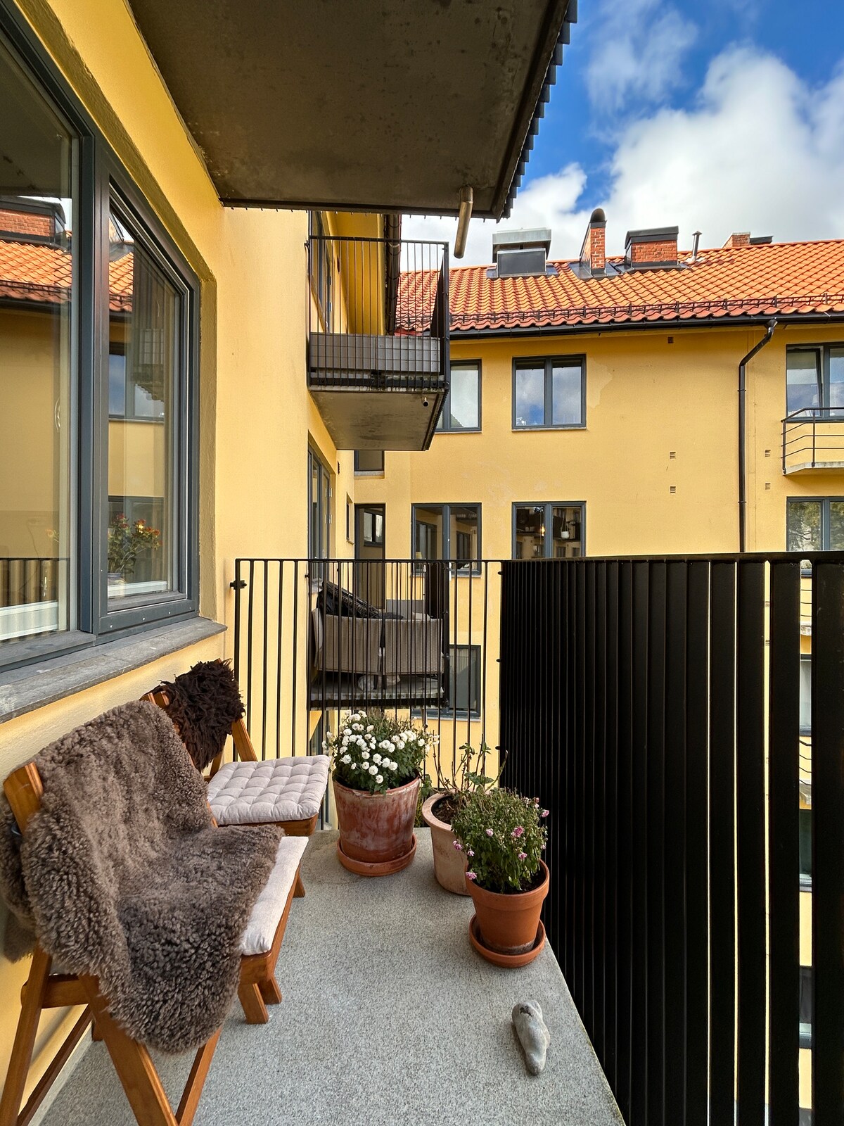 Classic apartment in nordic design. Facing a quiet garden w/flowers and fruittrees. A beautiful vibrant neighbourhood. Spacious livingroom: TV w/chromecast, fireplace, table for dinner & work. Sofa. Kitchen: Dishwasher, washingmachine, supplies for cooking and baking, Moccamaster, french press, coffegrinder, kettle. Bedroom 1: Double bed 160x200 Bedroom 2: 2 beds 90x200 / bunk for adults Small functional bathroom. For your baby: High chair, travel cot, changing pad, stroller.