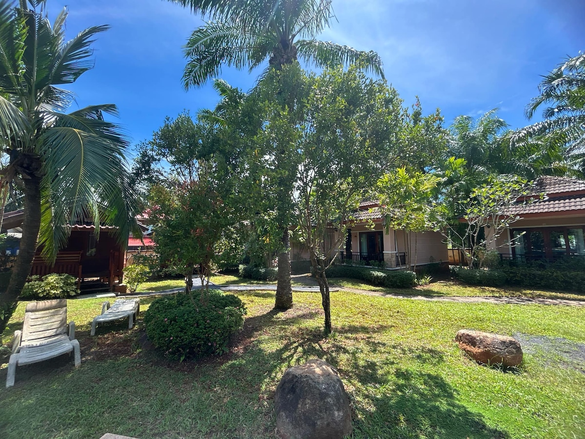 Thai-style wooden bungalow with large bed and breakfast. 1 bedroom, 1 bathroom with balcony and amenities. For solo or family stays. Located in Tha Len Palm Paradise Resort, surrounded by palm trees and lush nature. Quiet and private. The property is close to the pier to Koh Yao. It takes only 3 minutes to walk. Nearby, there is a kayak rental point for paddling and viewing the scenery of Tha Len Bay. It takes only 3 minutes to walk. Tha Len Bay takes only 5 minutes to walk and only 5 minutes by car to Khao Thong Hill Restaurant.
