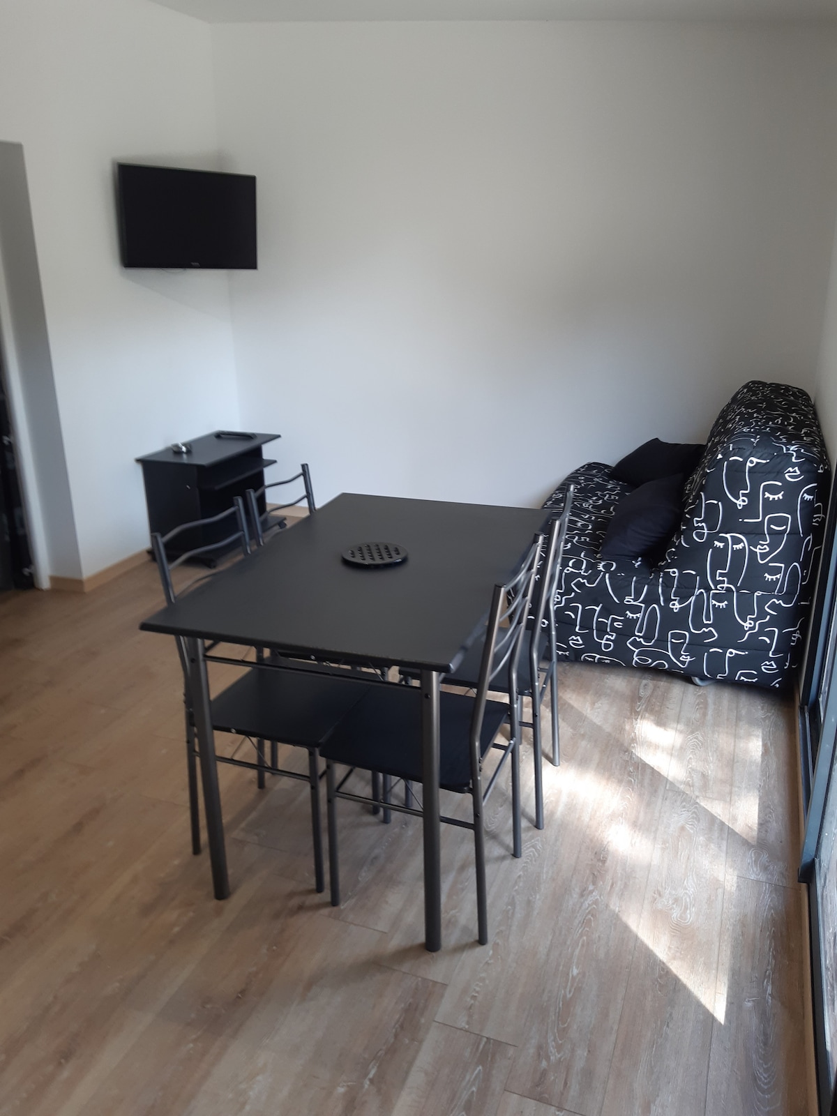 Grand studio de 35 m2 , entièrement neuf, tout confort. Location possible nuit, semaine, mois. Le studio accueille 3 adultes maxi où 2 adultes + 2 enfants, 1 lit 140+1 canapé convertible 120 en lit. L'ensemble est entièrement équipé : meubles, cuisine, vaisselle, micro-onde, four, frigo, plaque 4 feux, machine à café KRUPS DOLCE GUSTO bouilloire, linge de lit serviettes. Un rez-de-jardin au calme, avec table, chaises, vous permet de manger à l'extérieur. Parking privé situé près du logement.