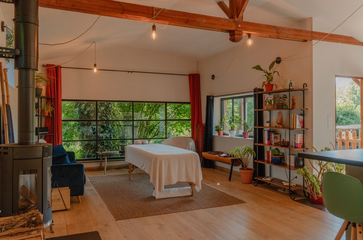 This cozy little nest overlooks a forest valley. The materials used, entirely natural, give a feeling of well-being that echoes the stunning view of the treetops as far as the eye can see. You will love this south and east facing cocoon offering no view of houses, roads or electric wires, only greenery. The city center is less than 300 m away. Cinema, shops, supermarket, restaurants, swimming pool, tennis court, playground for little ones... And the forest is in front of you!