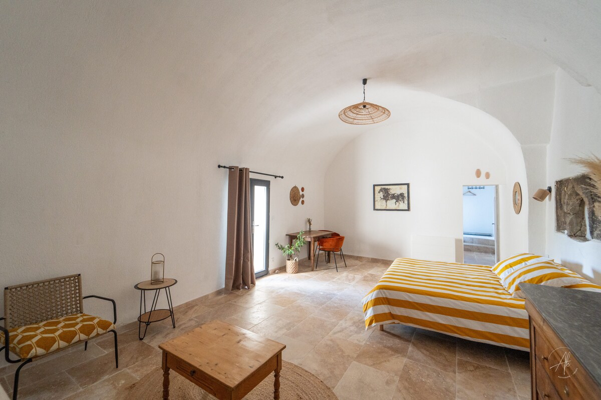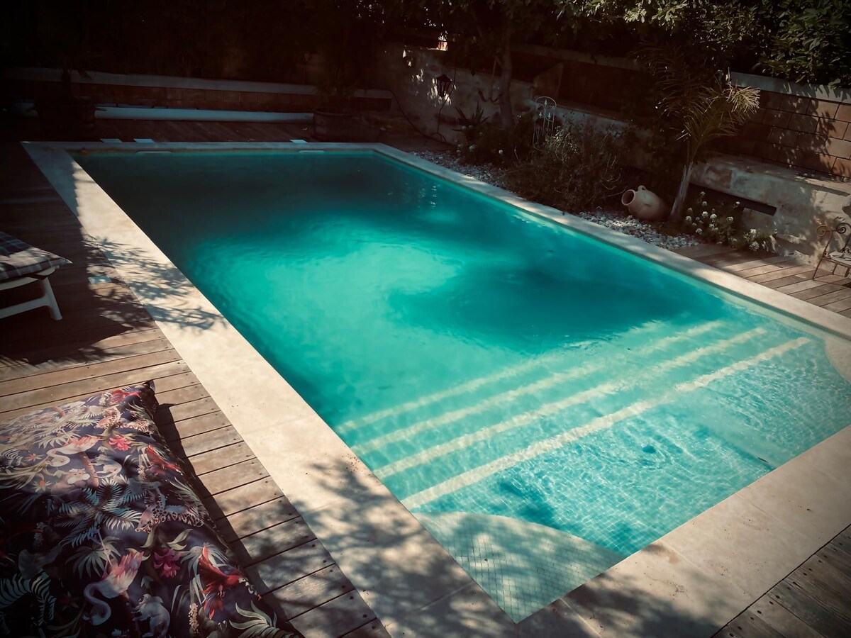 Kick back and relax in this calm, stylish space. Located in Sussargues in Hérault, in the heart of the vineyards and the Garrigues, 25 minutes from Montpellier and the beach, in a small village with all amenities, this studio will make you travel thanks to its decoration. The studio is attached to our house where we live with our 2 children. Pleasant pool, treated with salt, out of sight. Garden and large terrace.