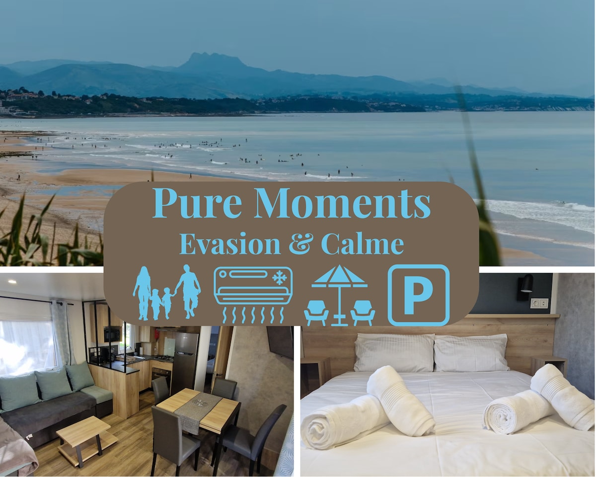 Large 63 m2 air-conditioned chalet in a quiet wooded and flowery area, in a residential park with common and secure swimming pool, 10 minutes from the beaches of Hossegor and Seignosse. Peaceful neighborhood allowing quick access to bike paths for the ocean. Great for families.