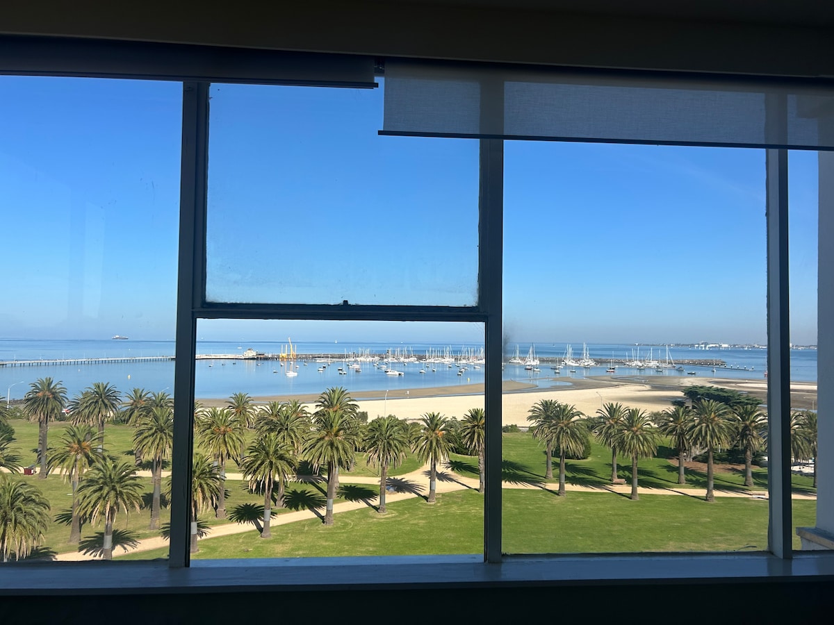 This two-bedroom apartment has stunning views across Port Phillip Bay and Melbourne CBD. It’s 80 metres to the city tram and 10 minutes by tram to MSAC. The penguin viewing platform and the Australian F1 track are 10-minute walks away. There are numerous restaurants, many within walking distance. One highlight is drinks on the balcony as the sun sets across the bay. And early risers may catch the hot-air balloons as they drift across the city.
